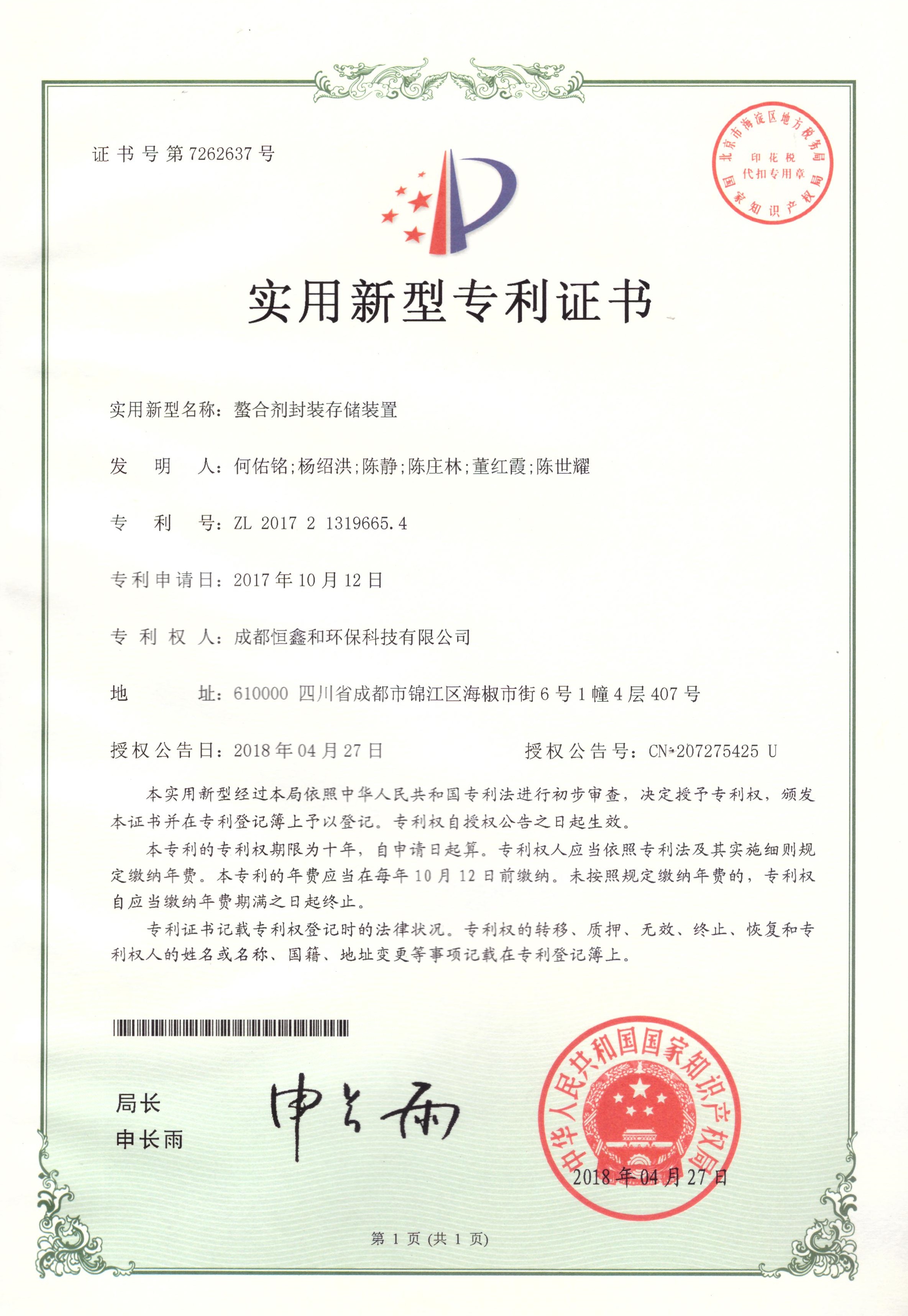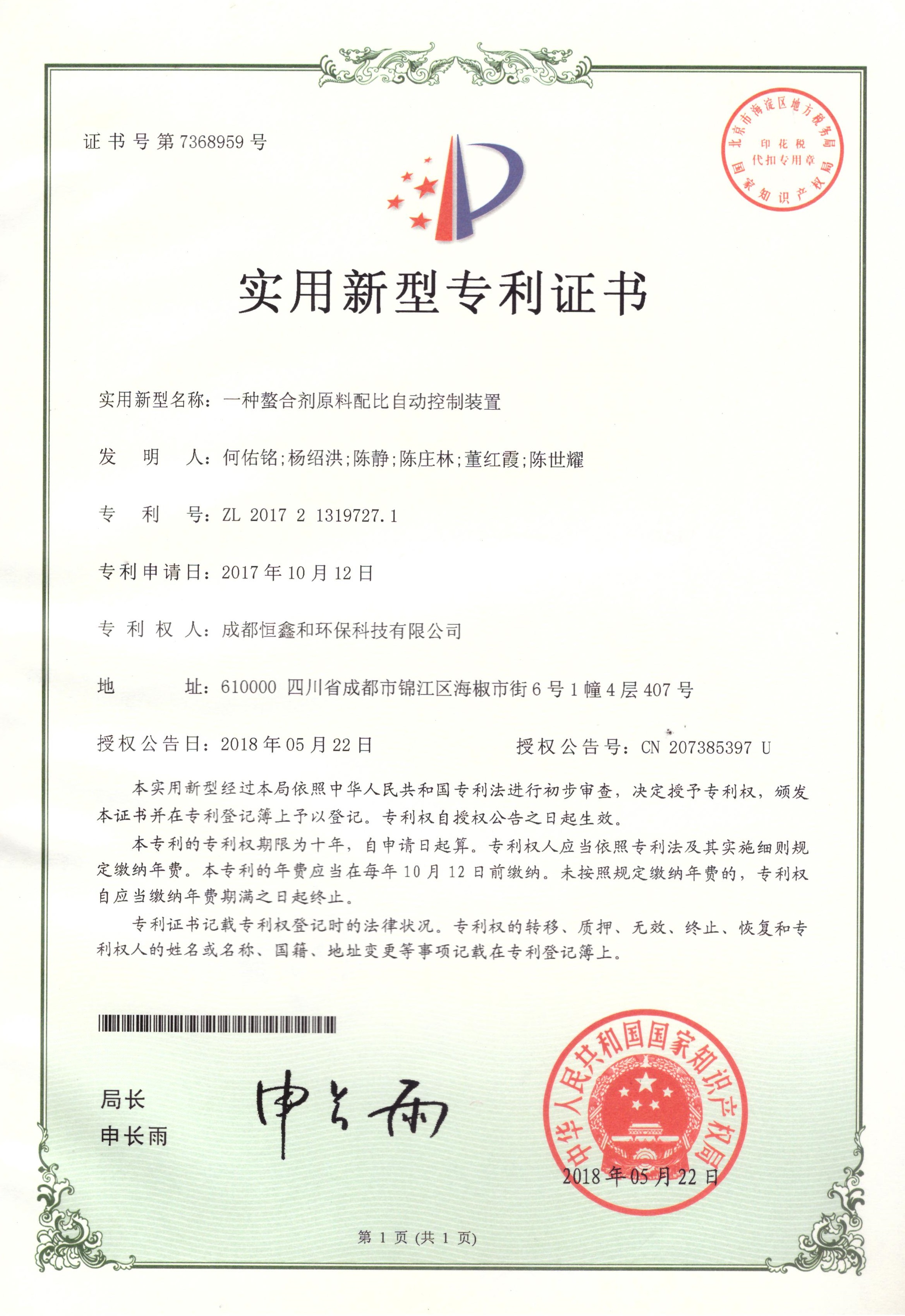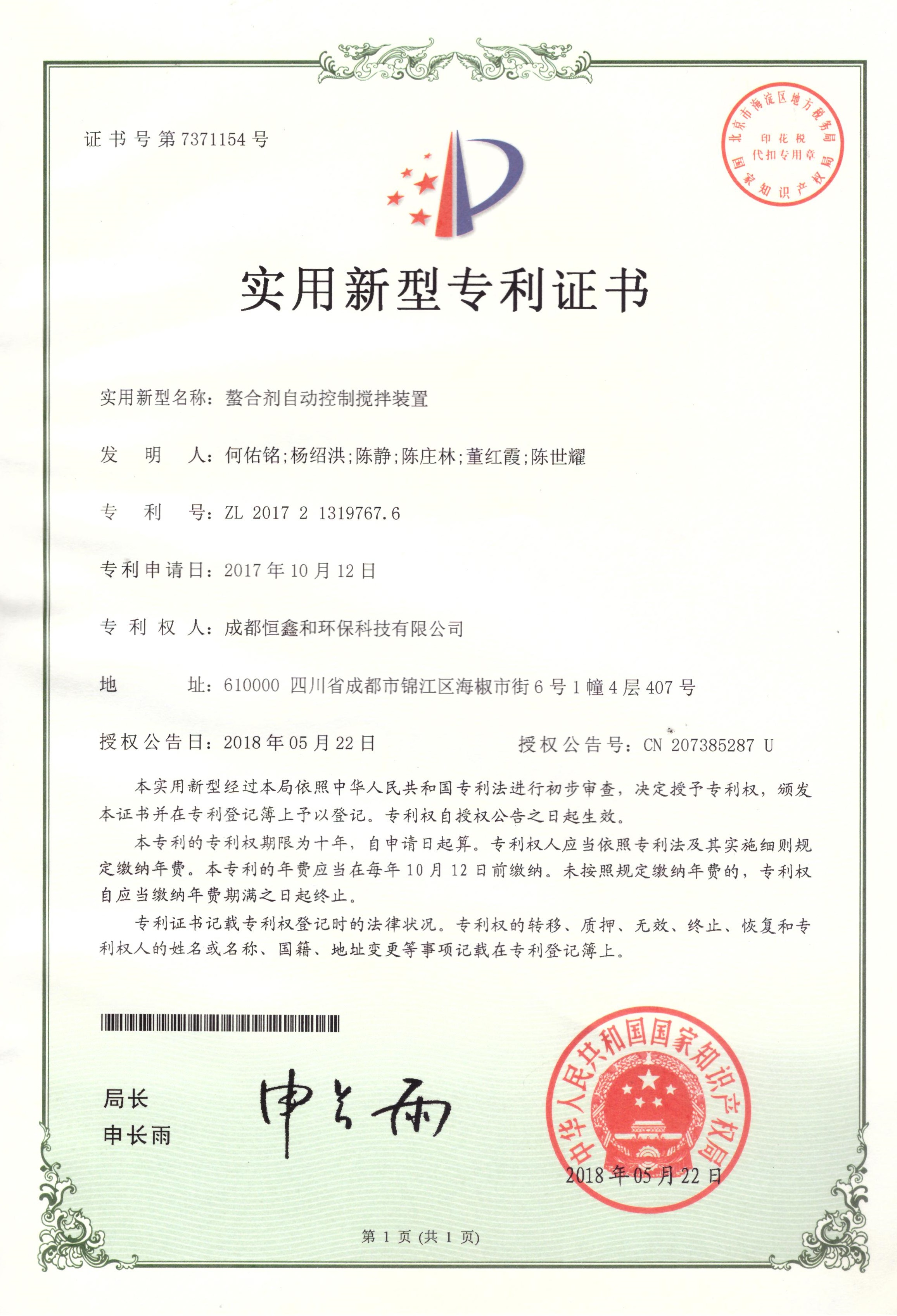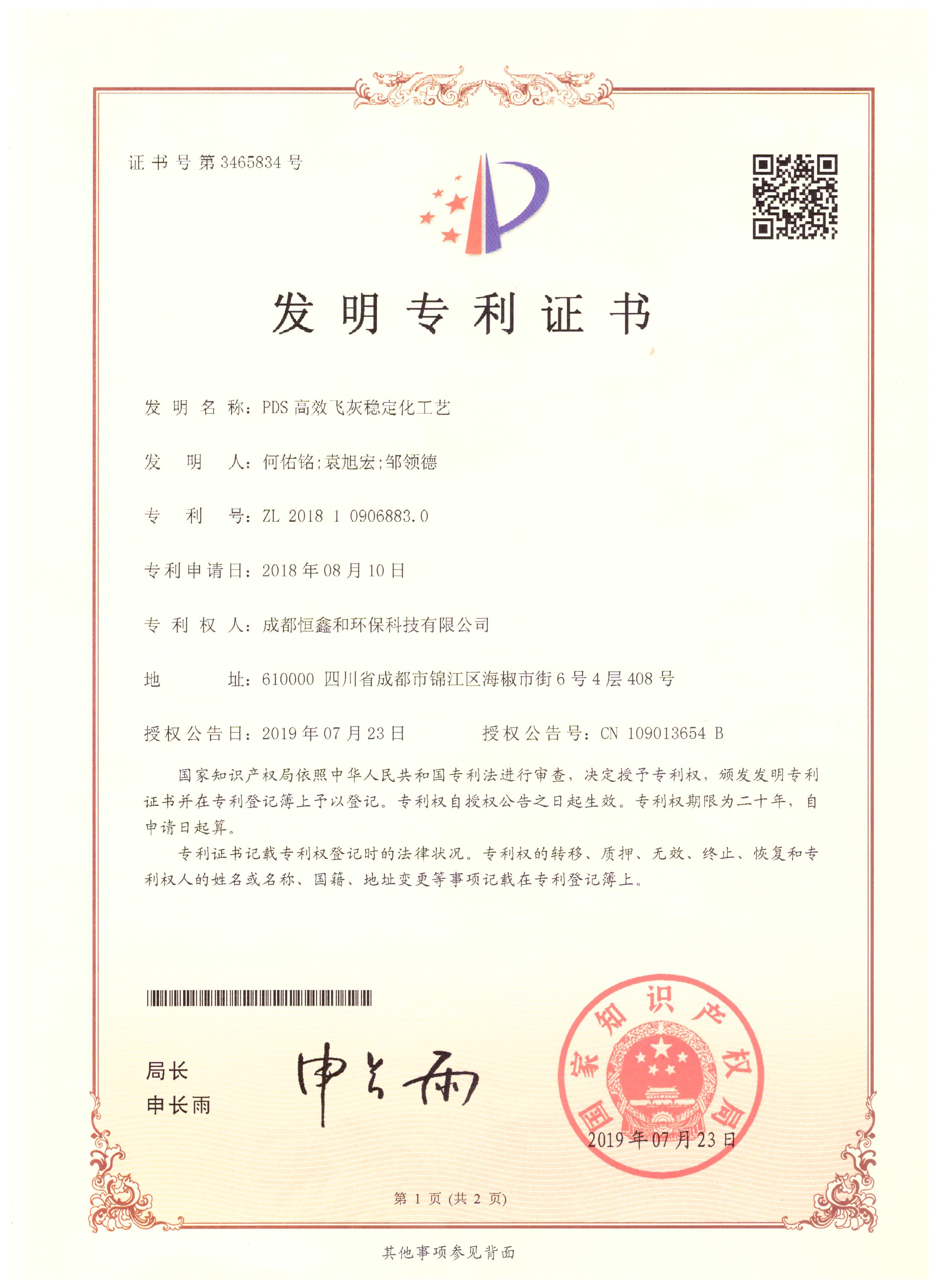 授權(quán)證書(分步式飛灰固化處理設(shè)備)